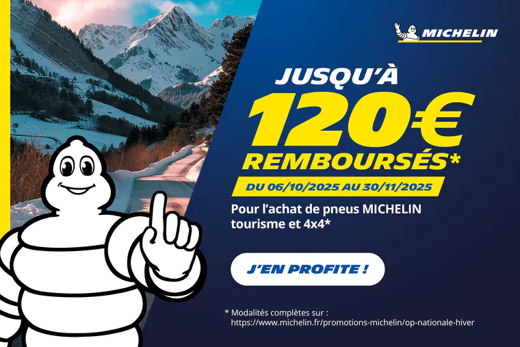 Offre valable pour tout achat, de deux (2) ou quatre (4) pneumatiques MICHELIN dans les catégories Tourisme et 4×4 (Eté, Hiver ou CrossClimate) de même dimension et de même gamme (à l’exclusion des gammes camionnette « MICHELIN AGILIS » et camping-car « MICHELIN CROSSCLIMATE CAMPING »), effectué du 06/10/2025 au 30/11/2025, chez Chrono Gom.